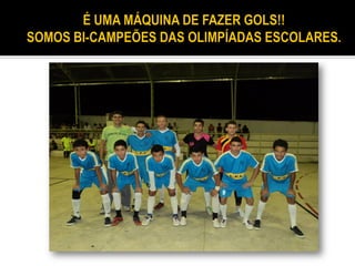 O documento parabeniza a equipe Sabino Guerra por se tornar bicampeã nas Olimpíadas Escolares de 2011. A vitória é atribuída ao trabalho em equipe e ao apoio de professores, coordenadores e diretor da escola. O texto também destaca os requisitos para conquistar um campeonato e homenageia os principais jogadores da equipe.