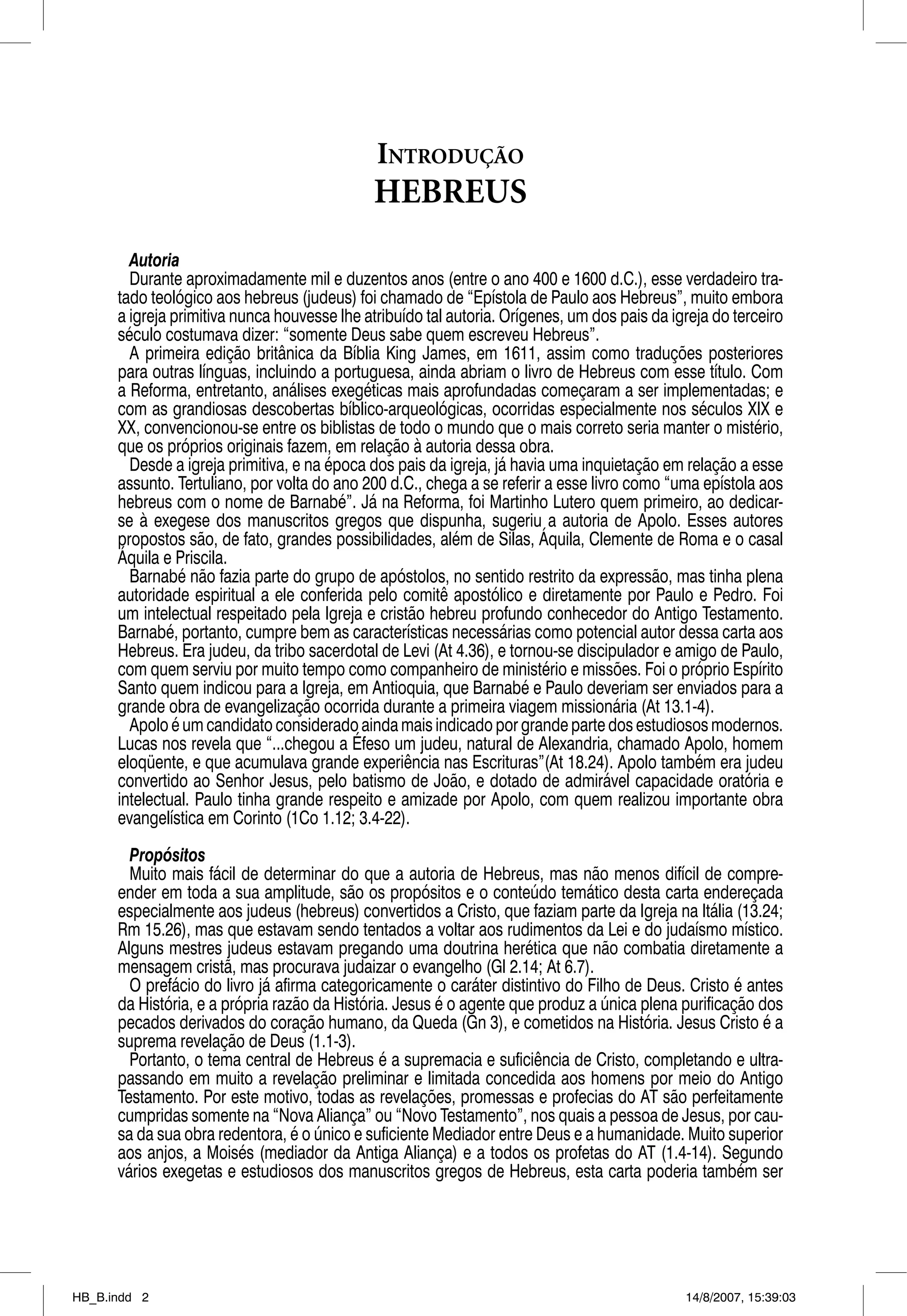 1) O documento introduz o livro de Hebreus, discutindo sua possível autoria e propósitos. Barnabé e Apolo são apresentados como possíveis autores.
