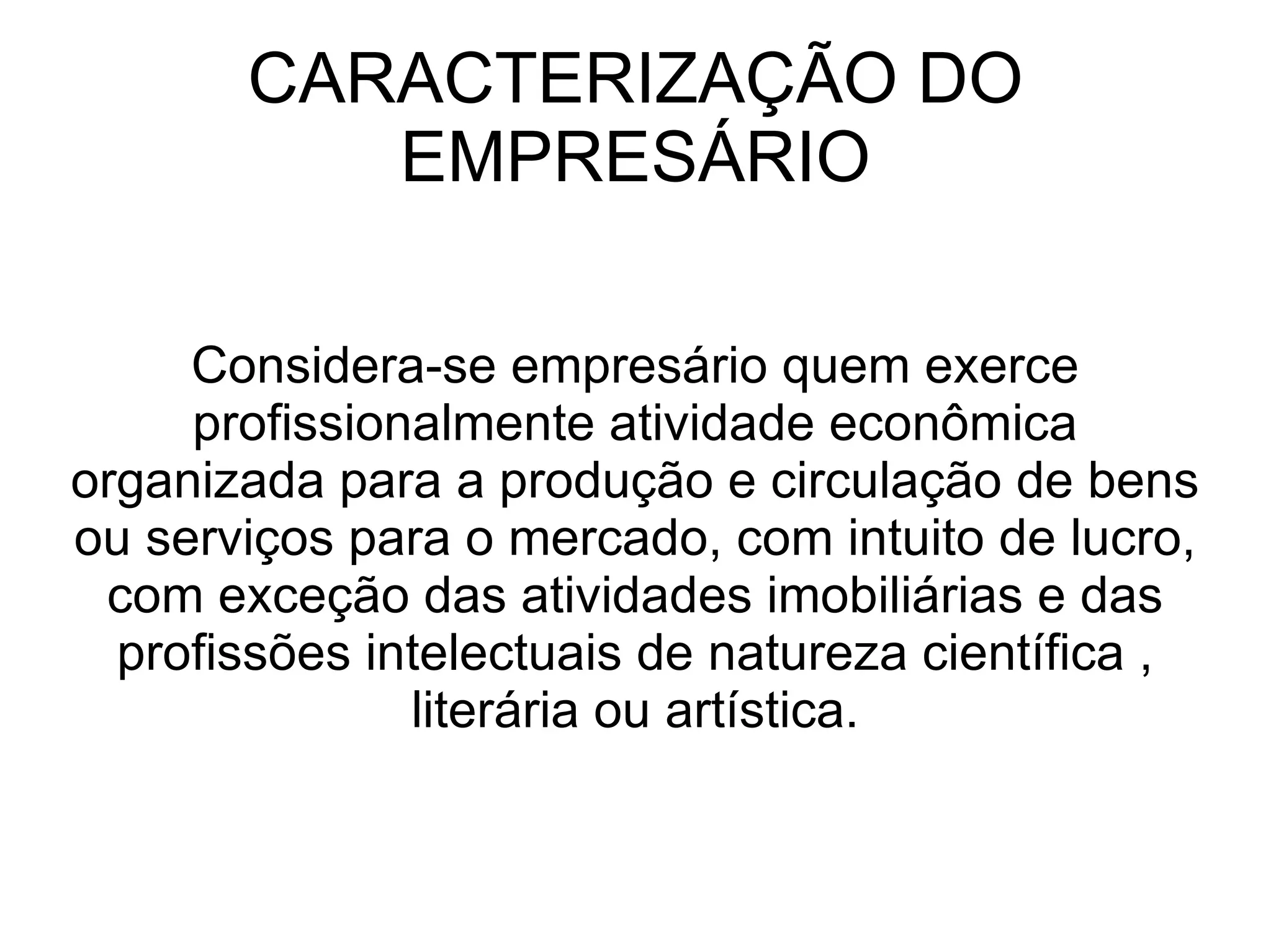 O documento descreve quem é considerado um empresário e quais são seus deveres legais, como a inscrição na Junta Comercial, manter contabilidade e documentação da empresa em ordem. Explica que a boa escrituração é necessária para evitar problemas judiciais e fiscais, e que em caso de falência, falta de documentação pode caracterizá-la como fraudulenta.