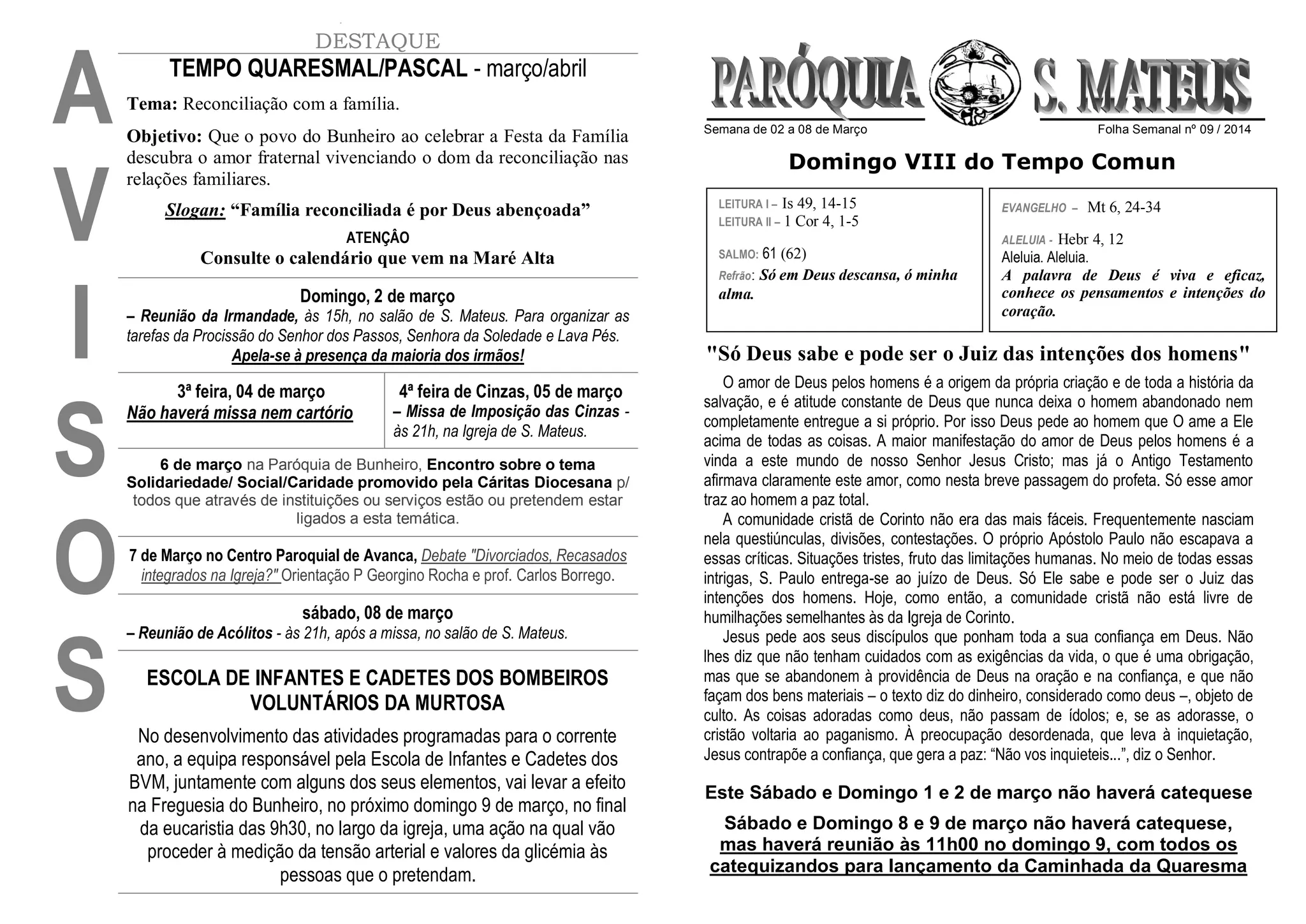 2) Anuncia reuniões e eventos religiosos na paróquia e em paróquias vizinhas durante a primeira semana de março.