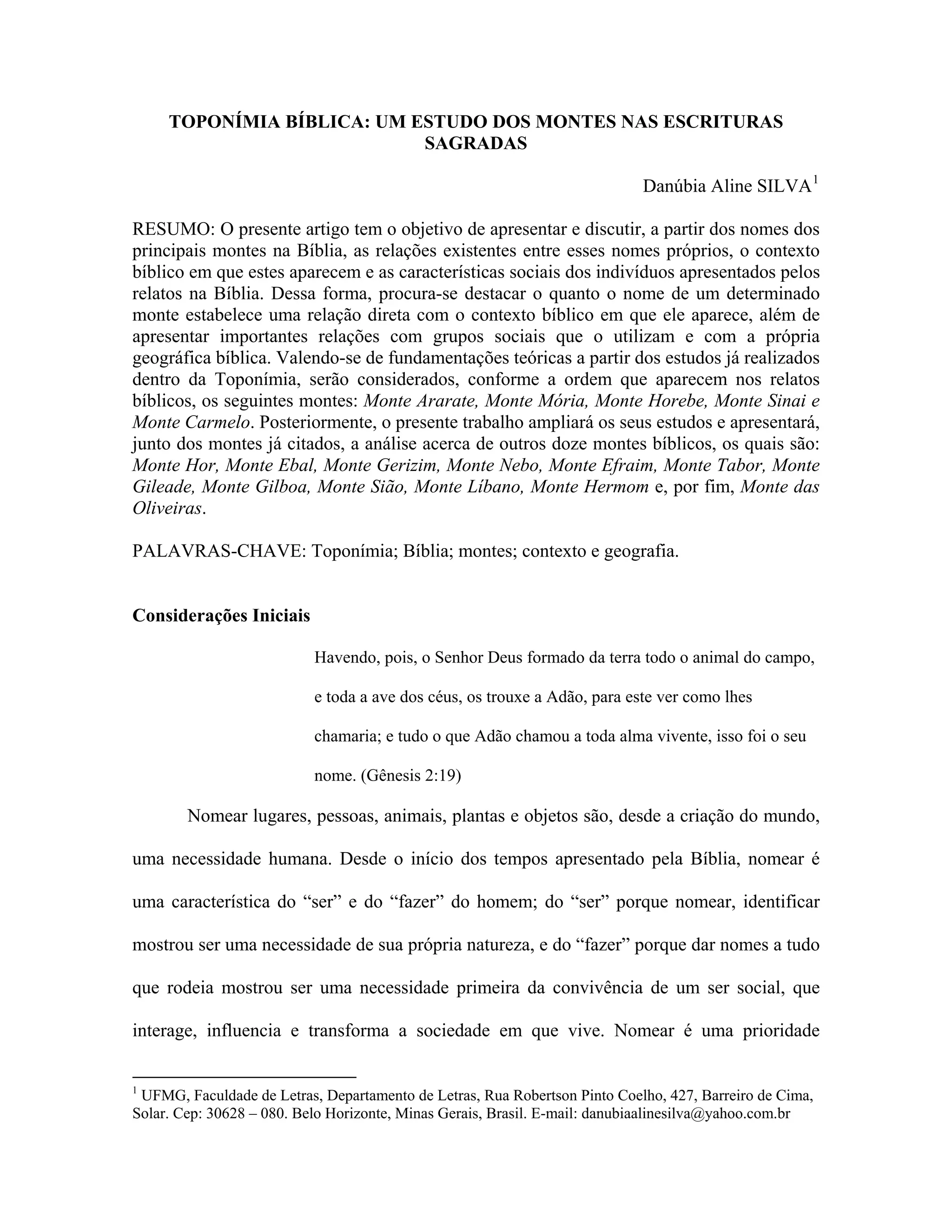 O documento discute a toponímia bíblica, focando nos nomes de montes nas Escrituras Sagradas. Apresenta brevemente cinco montes: Monte Ararate, onde a arca de Noé repousou após o dilúvio; Monte Moriá, local do sacrifício quase de Isaque por Abraão; Monte Horebe, onde Moisés recebeu os Dez Mandamentos; Monte Sinai, onde o povo de Israel recebeu a lei de Deus; e Monte Carmelo.