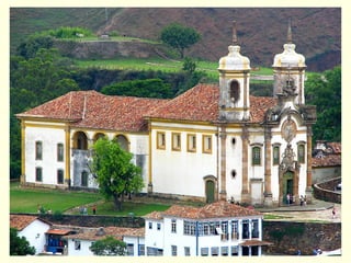 O documento apresenta informações sobre obras e artistas do período barroco no Brasil colonial, com destaque para Aleijadinho e suas esculturas em Minas Gerais. Também apresenta trechos de poemas de Gregório de Matos e um sermão do Padre Antônio Vieira.