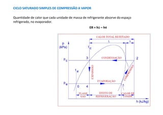 O documento descreve o ciclo de refrigeração por compressão a vapor, incluindo: 1) as etapas do ciclo saturado simples, 2) perdas de efeito refrigerante no dispositivo de expansão, 3) cálculo da temperatura de evaporação e condensação, e 4) detalhes adicionais do ciclo real como superaquecimento e subresfriamento.