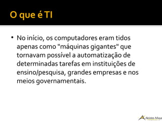 O documento discute o conceito de Tecnologia da Informação (TI), definindo-a como o conjunto de atividades e soluções que visam obter, armazenar, acessar, gerenciar e usar informações por meio de recursos computacionais. Também aborda a importância da informação e como profissionais de TI auxiliam no uso adequado de tecnologias para transformar dados em valor para empresas e instituições.