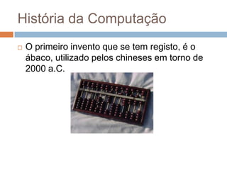 O documento descreve a história da computação, começando com o ábaco chinês em 2000 a.C. e prosseguindo até as gerações atuais de computadores. Detalha inventos pioneiros como a máquina diferencial de Charles Babbage no século 19 e o ENIAC, o primeiro computador eletrônico na década de 1940. Também aborda o desenvolvimento de linguagens de programação ao longo das eras.