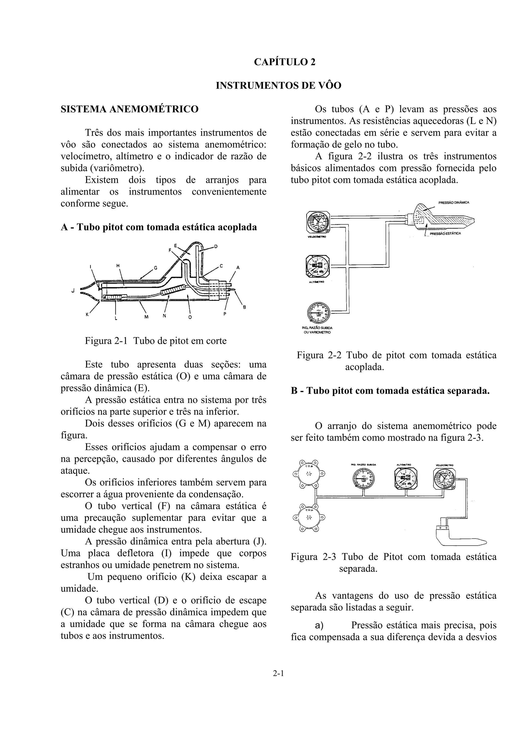O documento descreve o sistema anemométrico de um avião, que mede a velocidade, altitude e taxa de subida através de instrumentos conectados a tubos Pitot. Dois arranjos são possíveis: um tubo Pitot com tomada estática acoplada ou separada. Os três principais instrumentos (velocímetro, altímetro e variômetro) medem a pressão estática e/ou dinâmica fornecida pelo sistema. O velocímetro funciona por diferença de pressão, comparando a pressão estática da atmosfer