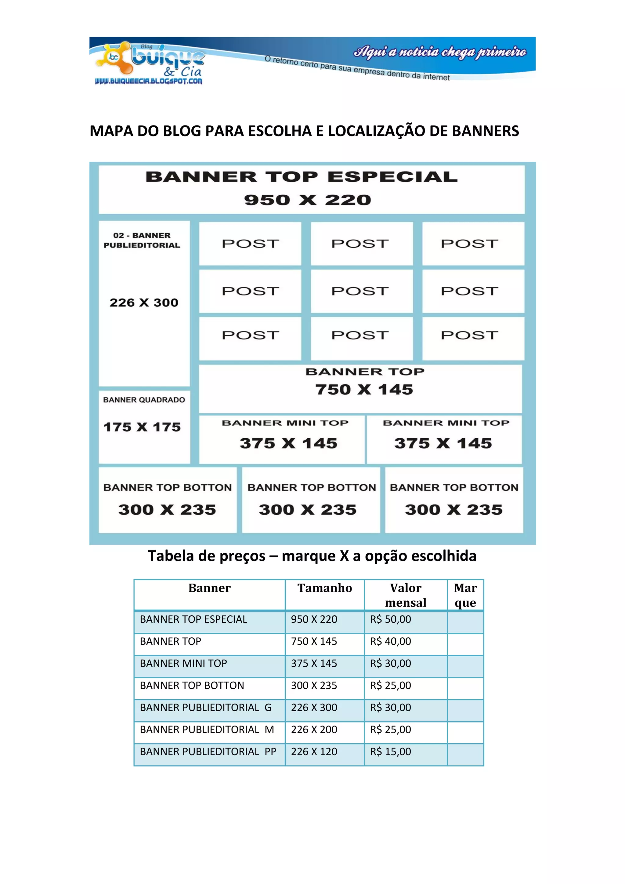O documento apresenta uma tabela de preços para diferentes tipos e tamanhos de banners em um blog, variando de R$15 a R$50 por mês, incluindo opções como banner topo especial, topo, mini topo, topo inferior e publieditoriais grandes, médios e pequenos.