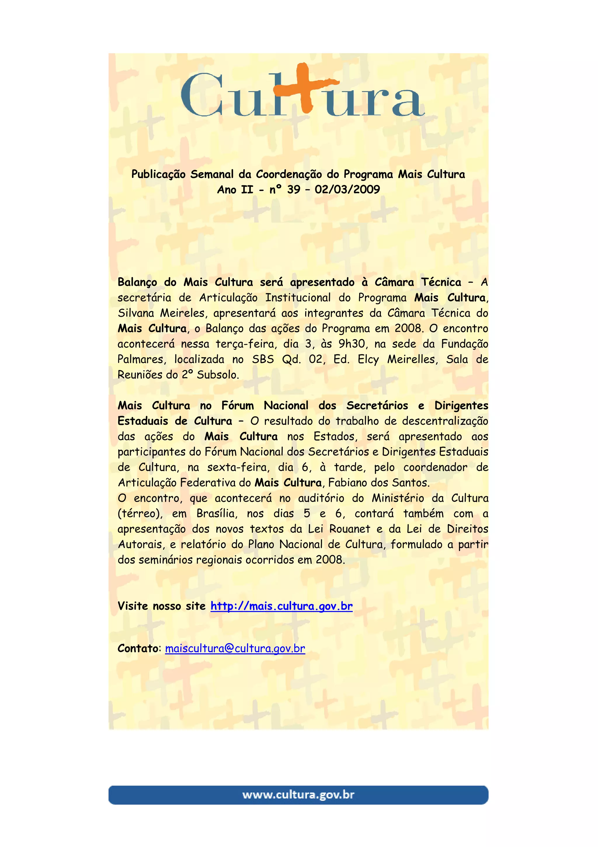 O secretária de Articulação Institucional do Programa Mais Cultura apresentará o balanço das ações do programa em 2008 para a Câmara Técnica do Mais Cultura. O coordenador de Articulação Federativa do Mais Cultura apresentará o resultado do trabalho de descentralização do programa nos estados para o Fórum Nacional dos Secretários e Dirigentes Estaduais de Cultura. O encontro do Fórum Nacional também contará com apresentações dos novos textos da Lei Rouanet e da Lei de Direitos Autorais e do Plano Nacional de Cultura.