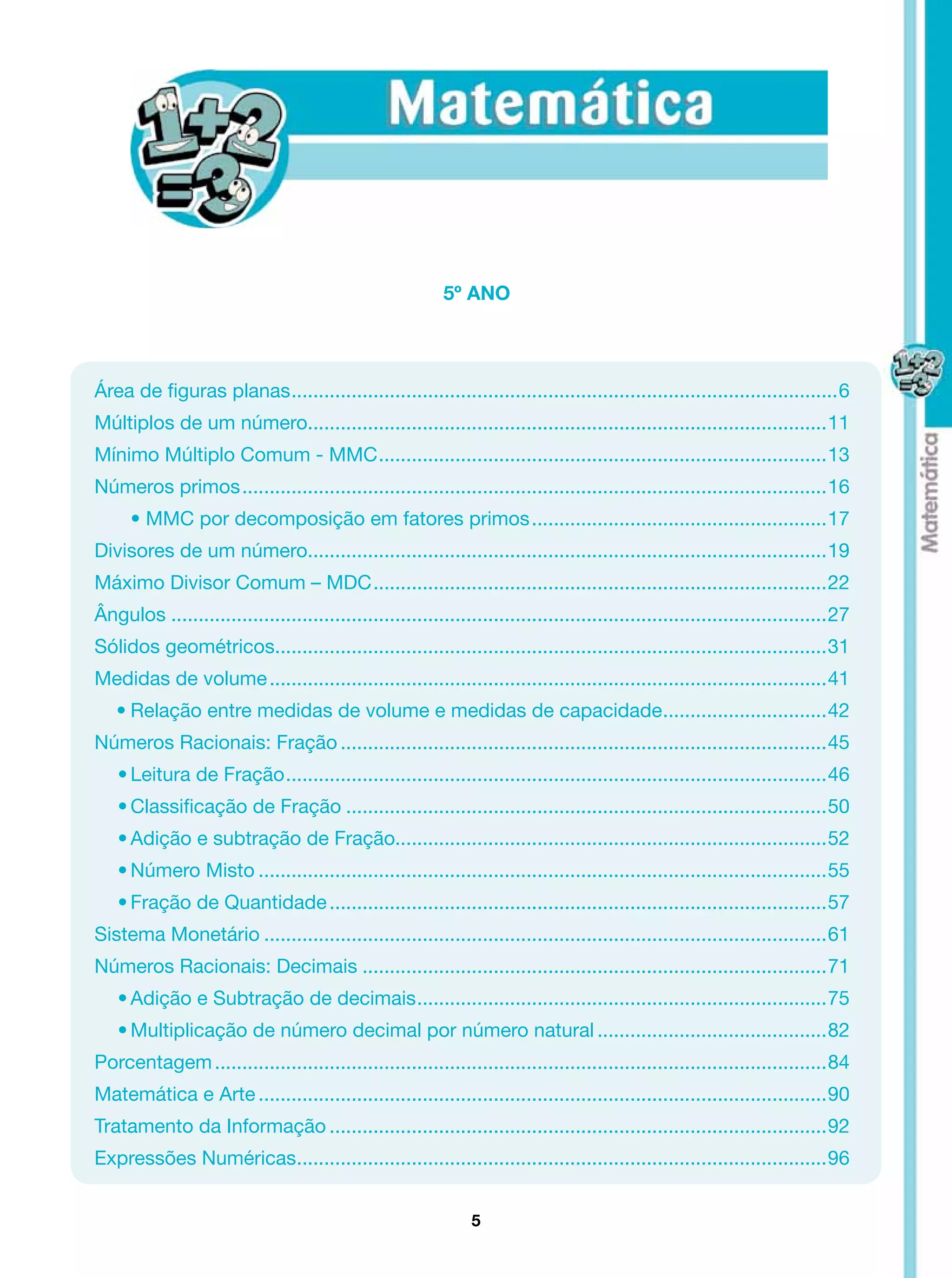 Este documento fornece informações sobre áreas de figuras planas, múltiplos de números, mínimo múltiplo comum (MMC), números primos e divisores de números. Aborda também frações, sistemas monetários, números decimais, porcentagem e expressões numéricas.