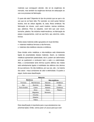 1) Os materiais têm propriedades únicas que determinam seu comportamento, conhecidas como "personalidade". 2) Estas propriedades físicas e químicas devem ser consideradas na escolha e fabricação de produtos. 3) As propriedades incluem resistência mecânica, elasticidade, condutividade térmica e elétrica, e afetam como os materiais respondem a esforços, temperatura e corrosão.