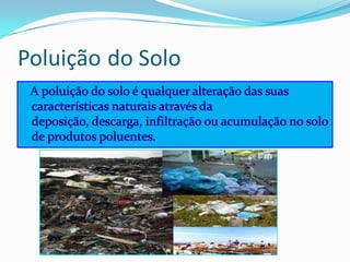 O documento discute os principais tipos e causas de poluição do solo e da água, incluindo aterros sanitários, lixo tóxico, uso excessivo de adubos e praguicidas. A poluição causa danos como a infertilidade do solo, contaminação da água e riscos à saúde humana. Soluções incluem tratamento de efluentes, produção orgânica e conscientização pública sobre conservação de recursos.