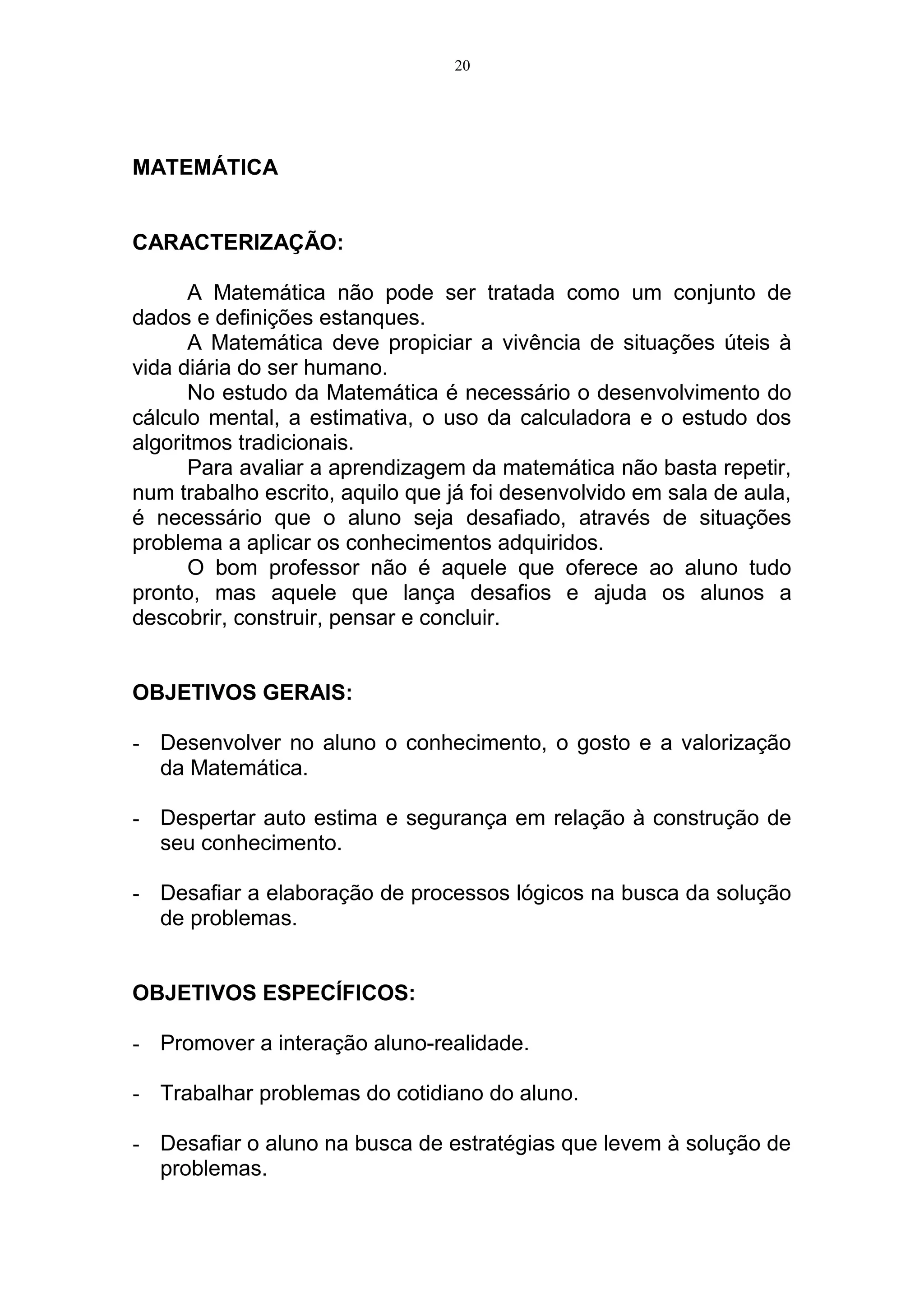 Este documento apresenta as características, objetivos e conteúdos da disciplina de Matemática para os anos finais do Ensino Fundamental. Ele descreve que a Matemática deve ser tratada de forma útil para a vida diária e desafiadora para os alunos. Os objetivos incluem desenvolver raciocínio lógico e a autoestima dos alunos, enquanto os conteúdos cobrem tópicos como conjuntos, equações, geometria e porcentagem.