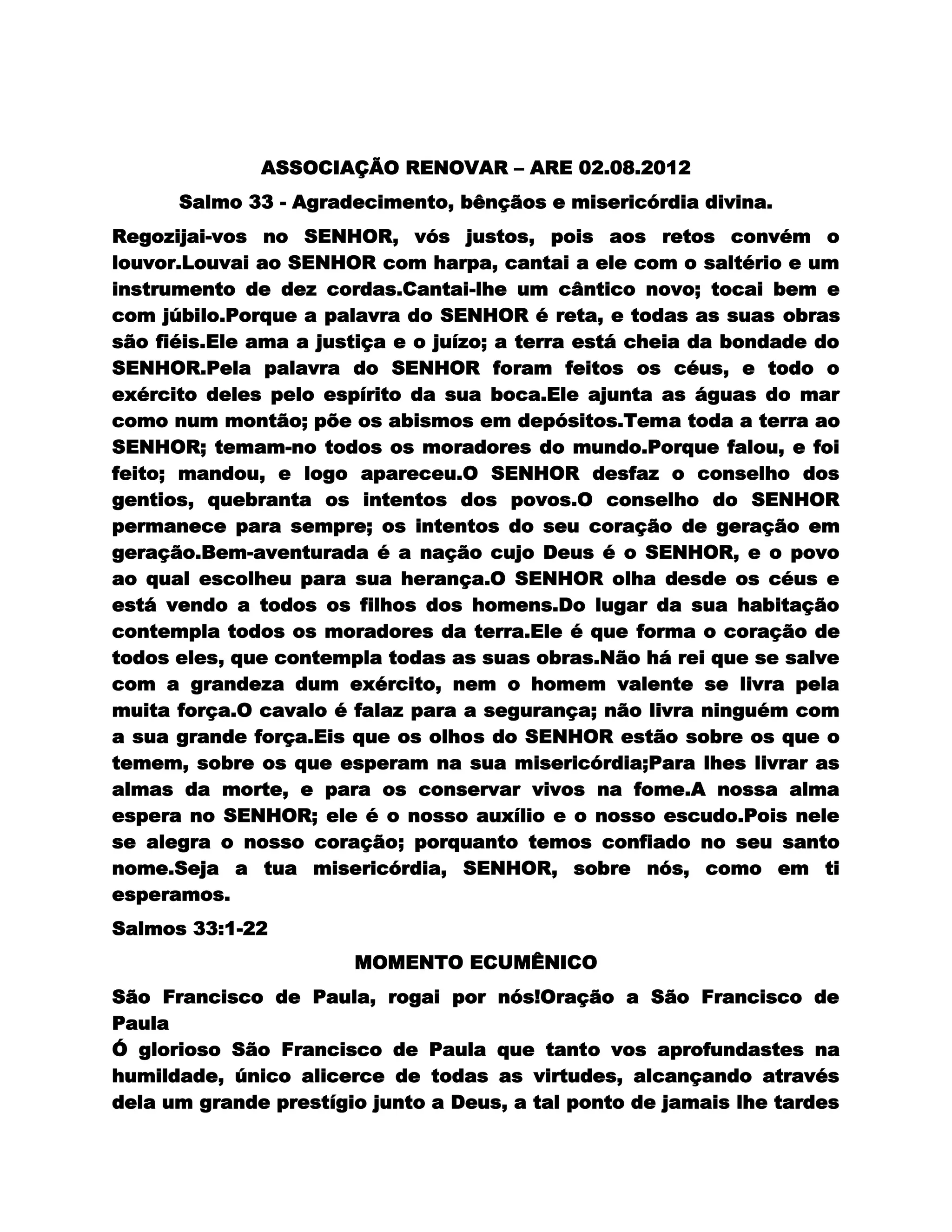 O documento contém uma reflexão sobre o Salmo 33, destacando a gratidão a Deus e a importância do dízimo como um ato comunitário e sagrado. Ele enfatiza que o dízimo não é uma obrigação individual, mas uma expressão da ligação do cristão com a comunidade e a igreja. O texto também convida à reflexão sobre o espírito comunitário necessário para a prática do dízimo de forma eficaz.