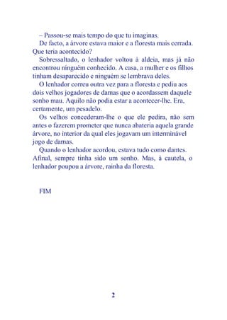 O lenhador estava prestes a cortar uma grande árvore na floresta quando ouviu duas vozes vindas do seu interior. Ao espreitar, viu dois velhos a jogarem damas dentro do tronco oco. Passou muito tempo a assistir ao jogo interminável, e quando saiu, descobriu que a floresta tinha mudado e a sua família tinha desaparecido. Pediu aos velhos que o acordassem daquele sonho estranho, e quando acordou, tudo tinha voltado ao normal. No entanto, poupou aquela á
