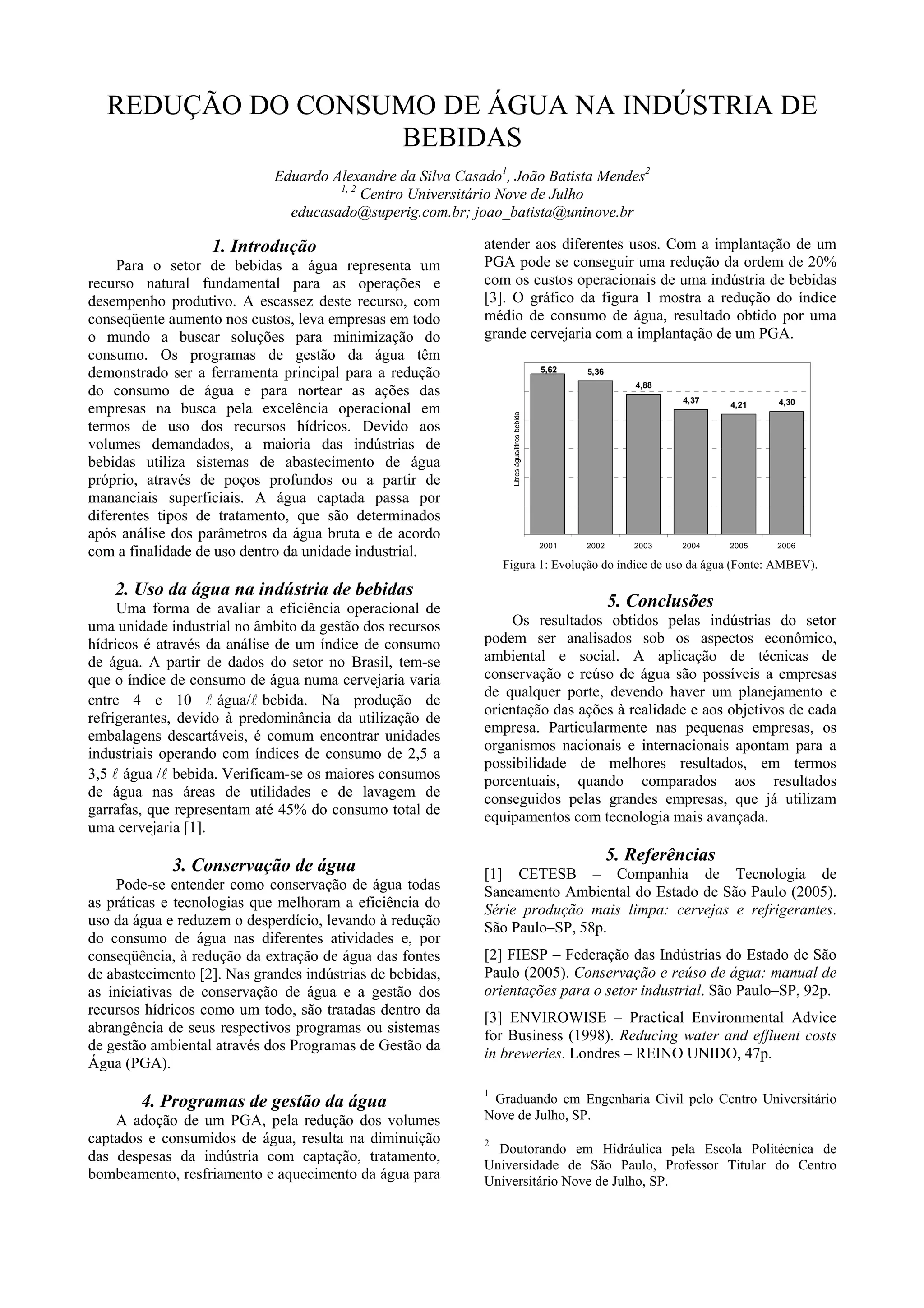 Este documento discute a redução do consumo de água na indústria de bebidas através da implementação de Programas de Gestão da Água (PGA). Os PGA podem reduzir o consumo de água em até 20% através da conservação e reuso da água. As áreas de utilidades e lavagem de garrafas são responsáveis por até 45% do consumo total de água em cervejarias.