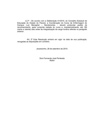 A resolução aprova a readequação curricular do curso de enfermagem do Centro de Ciências Biológicas do Campus Luiz Meneghel - Bandeirantes. O curso terá 40 vagas anuais, regime de matrícula anual e turno integral. A duração mínima e máxima do curso é de 5 a 8 anos com carga horária total de 4.490 horas entre conteúdos curriculares, atividades acadêmicas e estágio supervisionado.