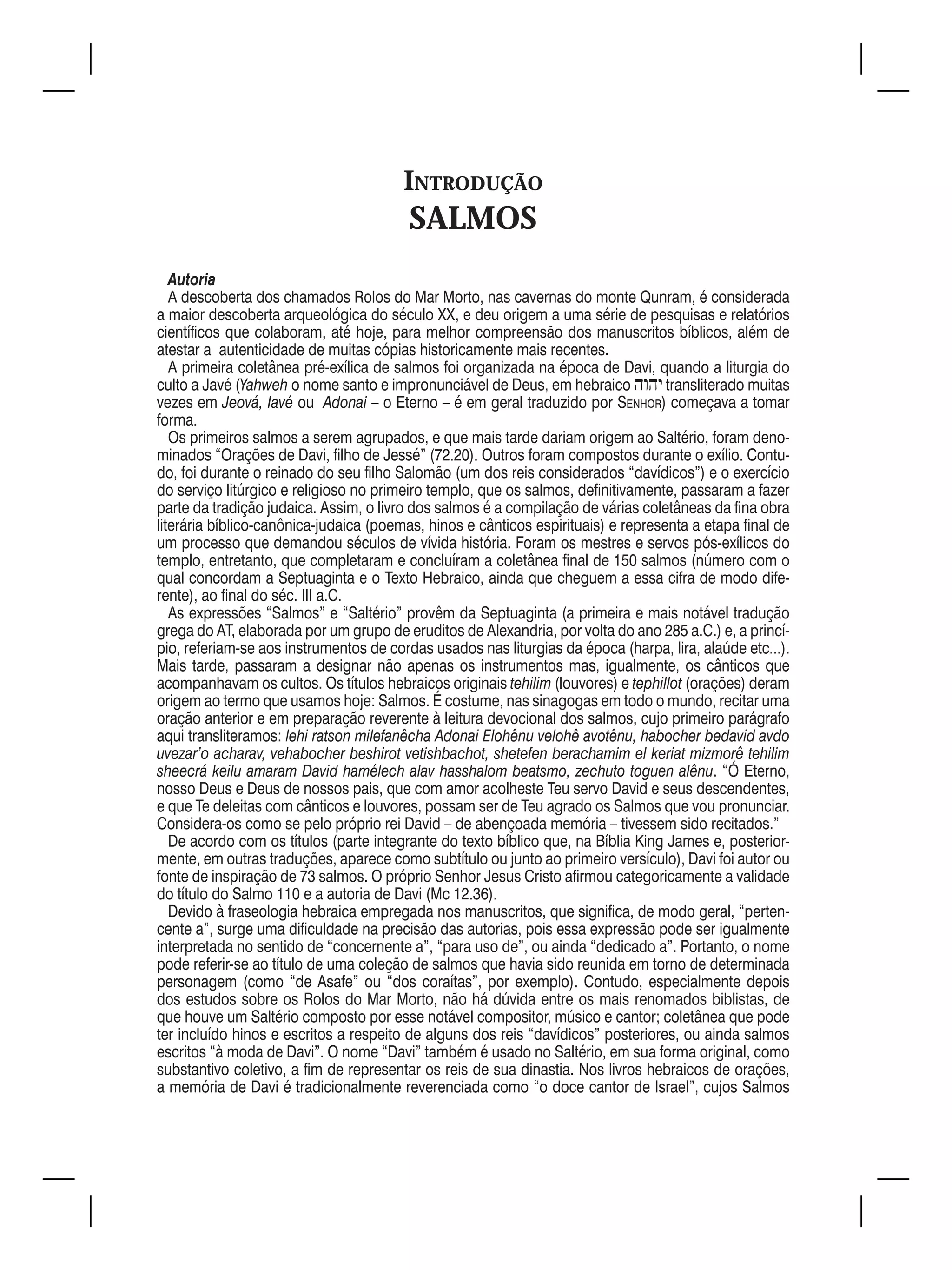 1) O documento discute a autoria e datação dos Salmos, explicando que muitos foram escritos por Davi no século X a.C., mas que a coletânea final dos 150 salmos foi concluída no século III a.C.
