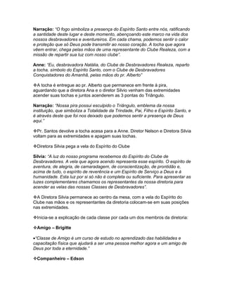 Este documento descreve o roteiro de uma cerimônia de admissão de lenço para um clube de desbravadores. O roteiro inclui a entrada de aventureiros, desbravadores e bandeiras, a entrada da Bíblia e da tocha, a explicação das classes de desbravadores, o juramento da lei e voto dos desbravadores. O objetivo é consagrar a cerimônia e reavivar os ideais do programa de desbravadores entre os participantes.