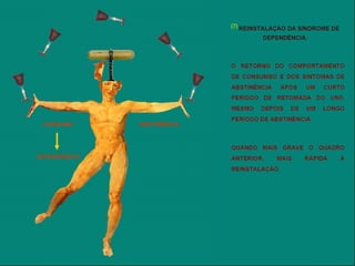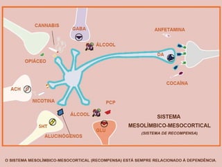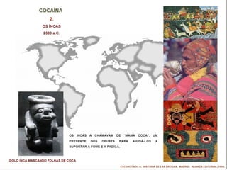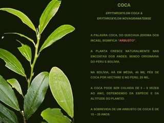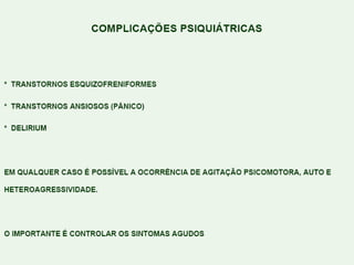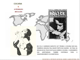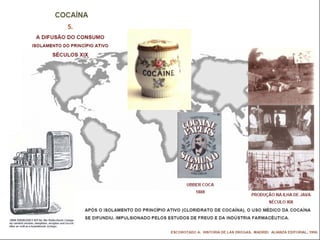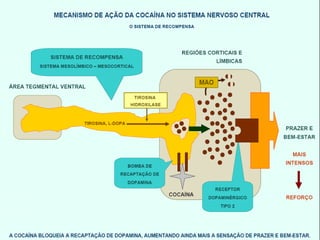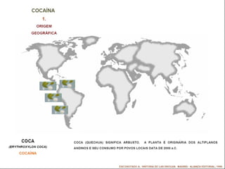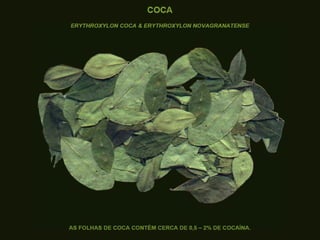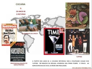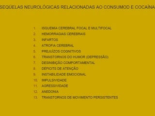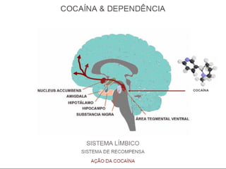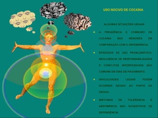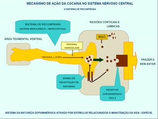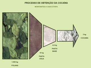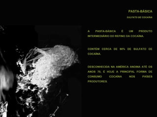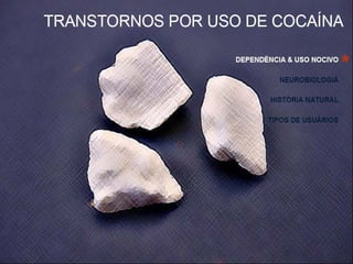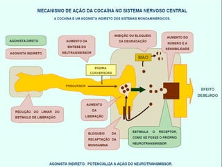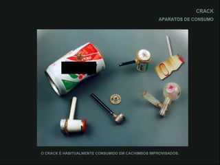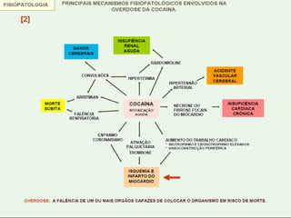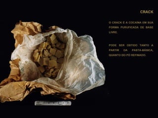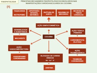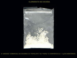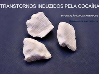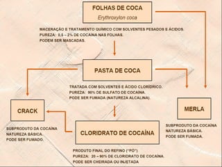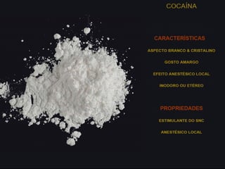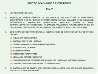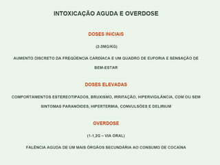O documento discute cocaína-crack, incluindo seu preparo, vias de exposição, farmacocinética, análises toxicológicas, efeitos agudos e crônicos, e alterações em diversos sistemas causadas pelo seu uso. É detalhado o metabolismo e excreção da cocaína, com a benzoilecgonina sendo o principal metabólito excretado na urina. Os efeitos do uso crônico incluem tolerância, sensibilização e "kindling".