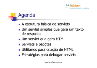 O documento discute os fundamentos de servlets em Java, cobrindo tópicos como: 1) A estrutura básica de servlets com os métodos doGet, doPost e init que definem o ciclo de vida; 2) Como gerar respostas HTML e texto simples a partir de um servlet; 3) Que o código principal fica nos métodos doGet e doPost, enquanto o init é chamado uma única vez.