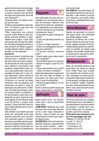 O documento fornece instruções para uma aula bíblica sobre a parábola do trigo e do joio contada por Jesus em Mateus 13. A aula inclui receber as crianças, momentos de louvor, memorização de versículos, oração, explicação da parábola usando cartazes, atividades, recapitulação e aplicação prática da lição.