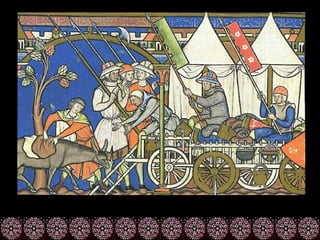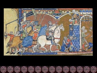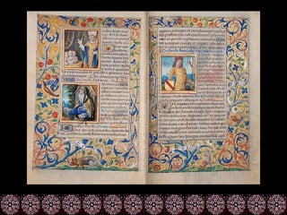 O documento descreve as principais formas de pintura religiosa durante a Idade Média, incluindo vitrais, iluminuras, afrescos e retábulos. As pinturas procuravam representar cenas religiosas de forma realista e transmitir emoção aos espectadores. Artistas como Giotto foram importantes por introduzir o naturalismo nas representações de figuras sagradas.