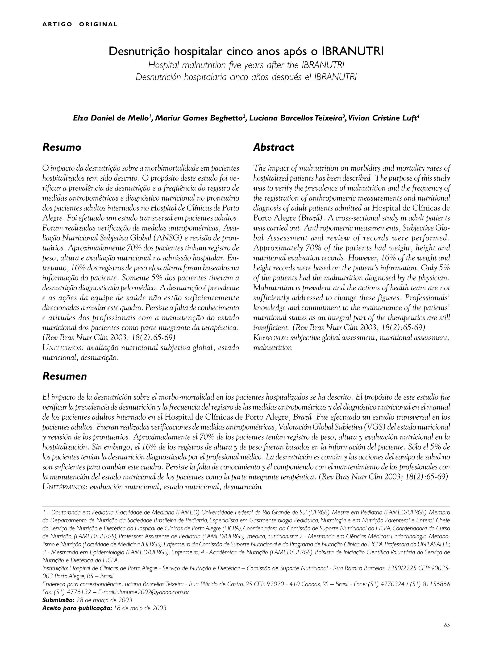 O documento descreve um estudo realizado em um hospital no Brasil para avaliar a prevalência de desnutrição em pacientes adultos internados e a frequência de registro de medidas antropométricas e diagnóstico nutricional. O estudo encontrou que aproximadamente 51% dos pacientes estavam desnutridos, porém apenas 5% tinham a desnutrição diagnosticada por um médico. Apesar de 70% dos pacientes terem registros de peso, altura e avaliação nutricional, os registros nem sempre se baseavam em medidas, e ações para melhorar