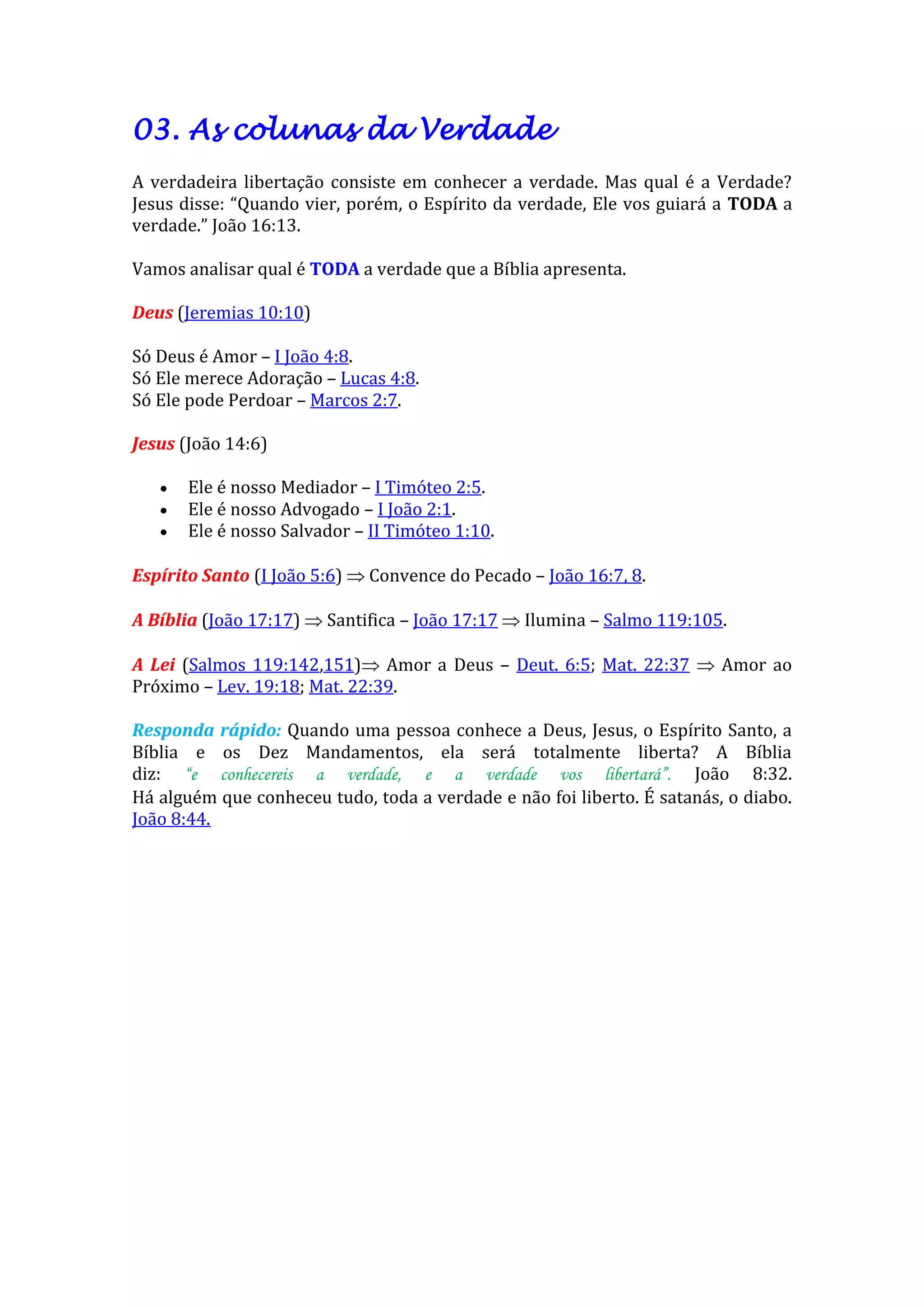 O documento discute a verdadeira libertação através do conhecimento da verdade total revelada por Deus. Apesar de Satanás conhecer toda a verdade por ter vivido no céu, ele não se firmou nela e se tornou inimigo da verdade. Para ser verdadeiramente livre, é necessário não só conhecer a verdade como se firmar nela através do batismo.