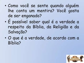 O documento discute a importância de conhecer a verdadeira liberdade que vem de conhecer completamente a Deus, Jesus Cristo e a Bíblia. Apresenta o conceito de que apenas o conhecimento teórico não é suficiente, sendo necessário um conhecimento prático e experimentado da verdade. Adverte que Satanás conhece a verdade teoricamente, mas nunca se firmou nela, e isso o levou a se tornar inimigo de Deus.