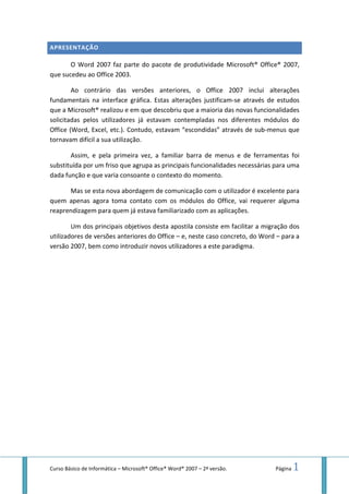 Este documento fornece uma introdução aos principais recursos da interface do usuário do Microsoft Word 2007. Discute 1) o novo paradigma de interface baseado em frisos que reúne menus e barras de ferramentas, 2) os sete principais frisos e suas funcionalidades, e 3) como navegar e usar as funcionalidades apresentadas nos frisos.