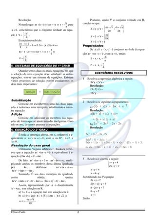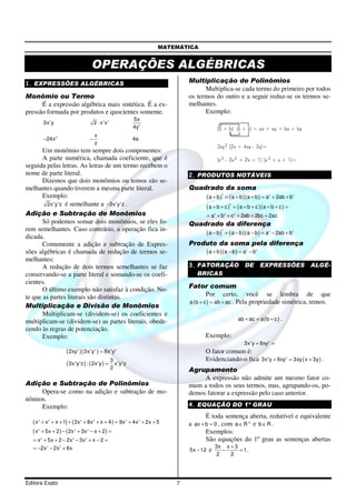 Este documento apresenta os principais tópicos sobre operações algébricas de primeiro grau: (1) Discute expressões algébricas, incluindo monômios, adição, subtração, multiplicação e divisão de monômios e polinômios; (2) Apresenta produtos notáveis e fatoração de expressões algébricas; (3) Define equações do primeiro grau e sua resolução; (4) Discutem sistemas de equações do primeiro grau.
