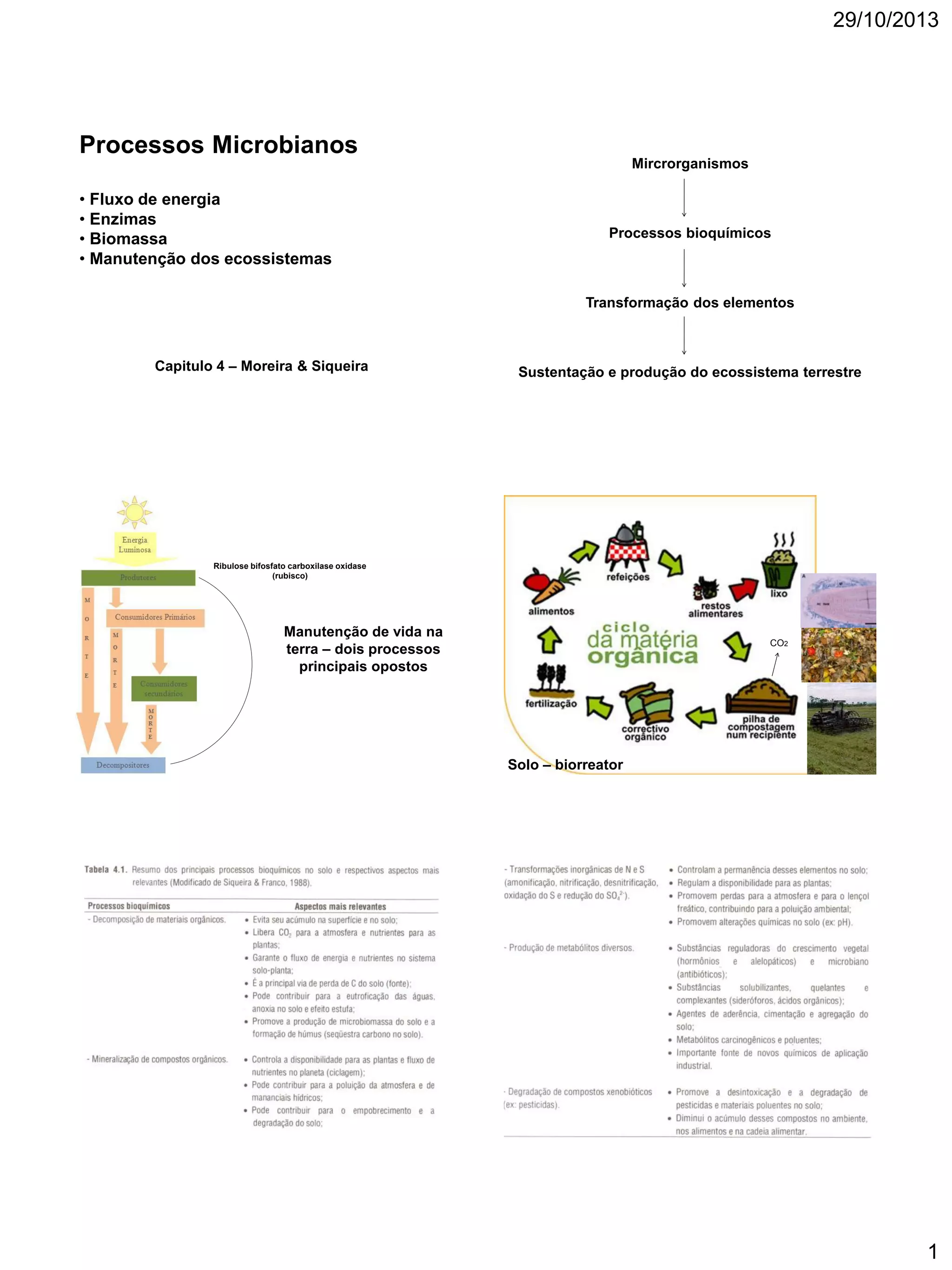 O documento discute processos microbianos no solo e sua importância para os ecossistemas terrestres. Aborda tópicos como fluxo de energia, enzimas, biomassa microbiana e sua relação com a sustentação e produção do ecossistema. Também apresenta índices para medir a atividade microbiana do solo e fatores que afetam a biomassa microbiana.