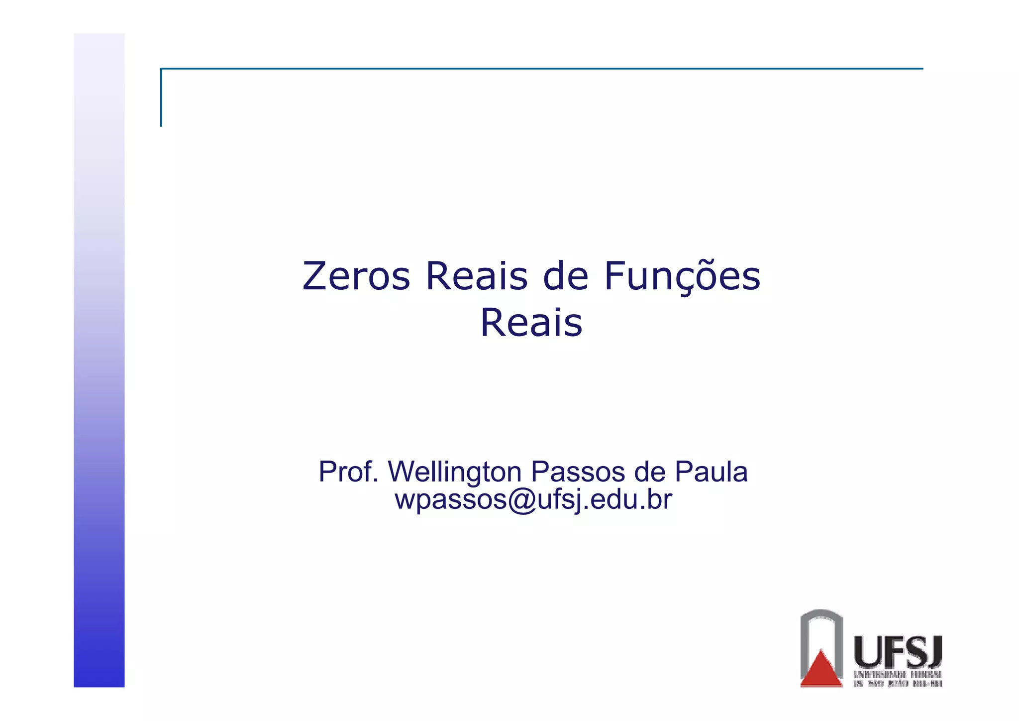 Este documento discute métodos numéricos para determinar zeros reais de funções reais. É dividido em três seções: 1) Isolamento de raízes, que trata da análise teórica e gráfica da função para isolar intervalos contendo cada raiz; 2) Refinamento de raízes, que apresenta métodos iterativos como a bisseção para refinar as aproximações das raízes; e 3) Critérios de parada para os métodos iterativos.