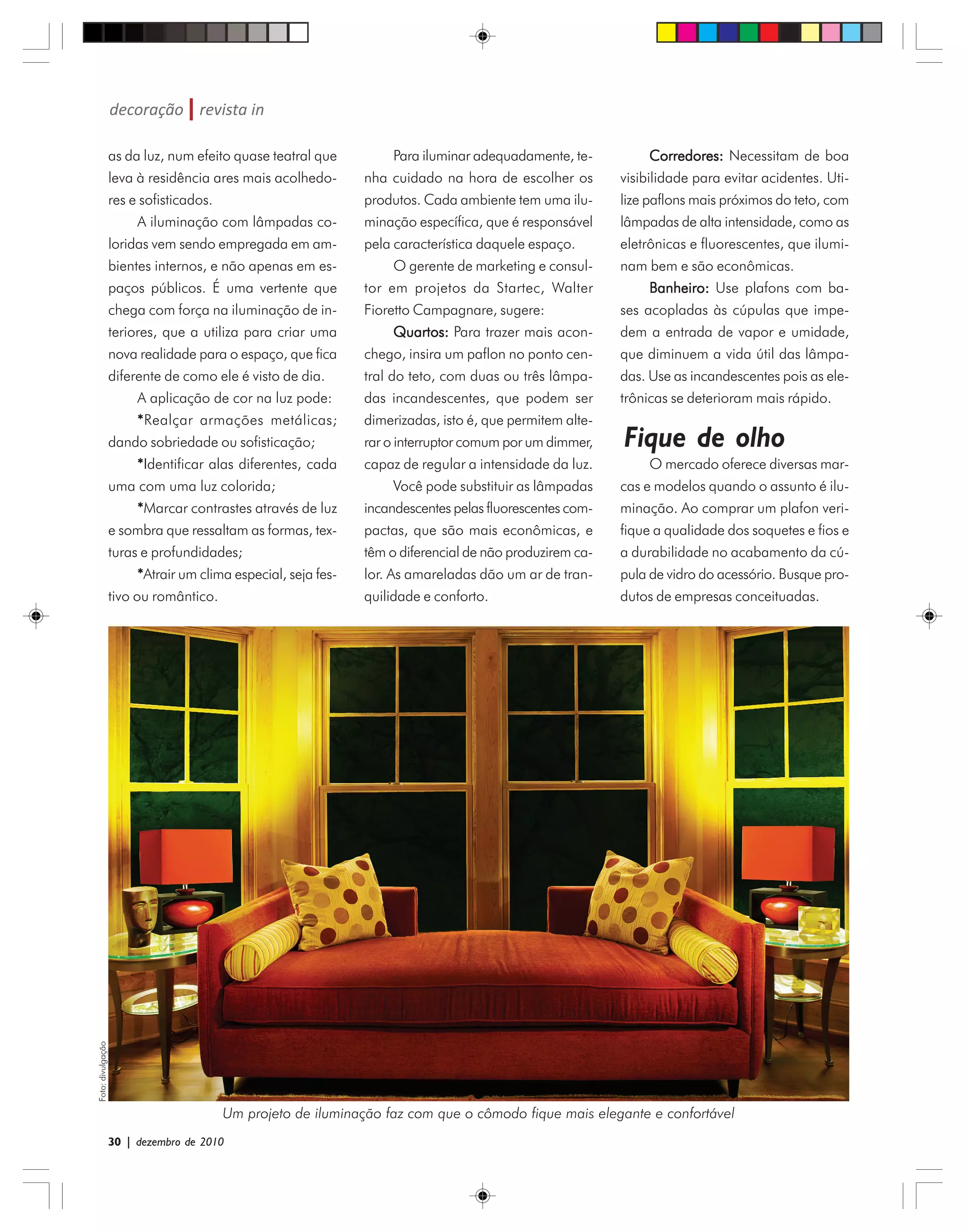 O documento fornece recomendações para iluminar diferentes ambientes de uma casa de forma adequada e econômica, sugerindo o tipo de lâmpada e posicionamento dos plafons para cada cômodo. Recomenda lâmpadas incandescentes ou fluorescentes amareladas para quartos, lâmpadas de alta intensidade para corredores, e lâmpadas incandescentes para banheiros. Aconselha verificar a qualidade dos produtos e buscar marcas conceituadas.