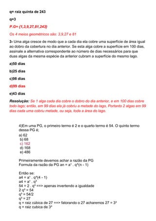 1) Uma progressão geométrica com 5 termos é dada. O terceiro termo é 90 e o quinto é 810. Os valores dos demais termos são calculados e a PG completa é determinada.