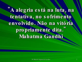 O documento contém uma coleção de citações sobre temas como aprendizado, descoberta, esforço, fé e felicidade. As citações destacam que o aprendizado vem dos erros, que a alegria está no esforço e não na vitória, e que a felicidade está nas pequenas coisas do caminho e não no destino final.