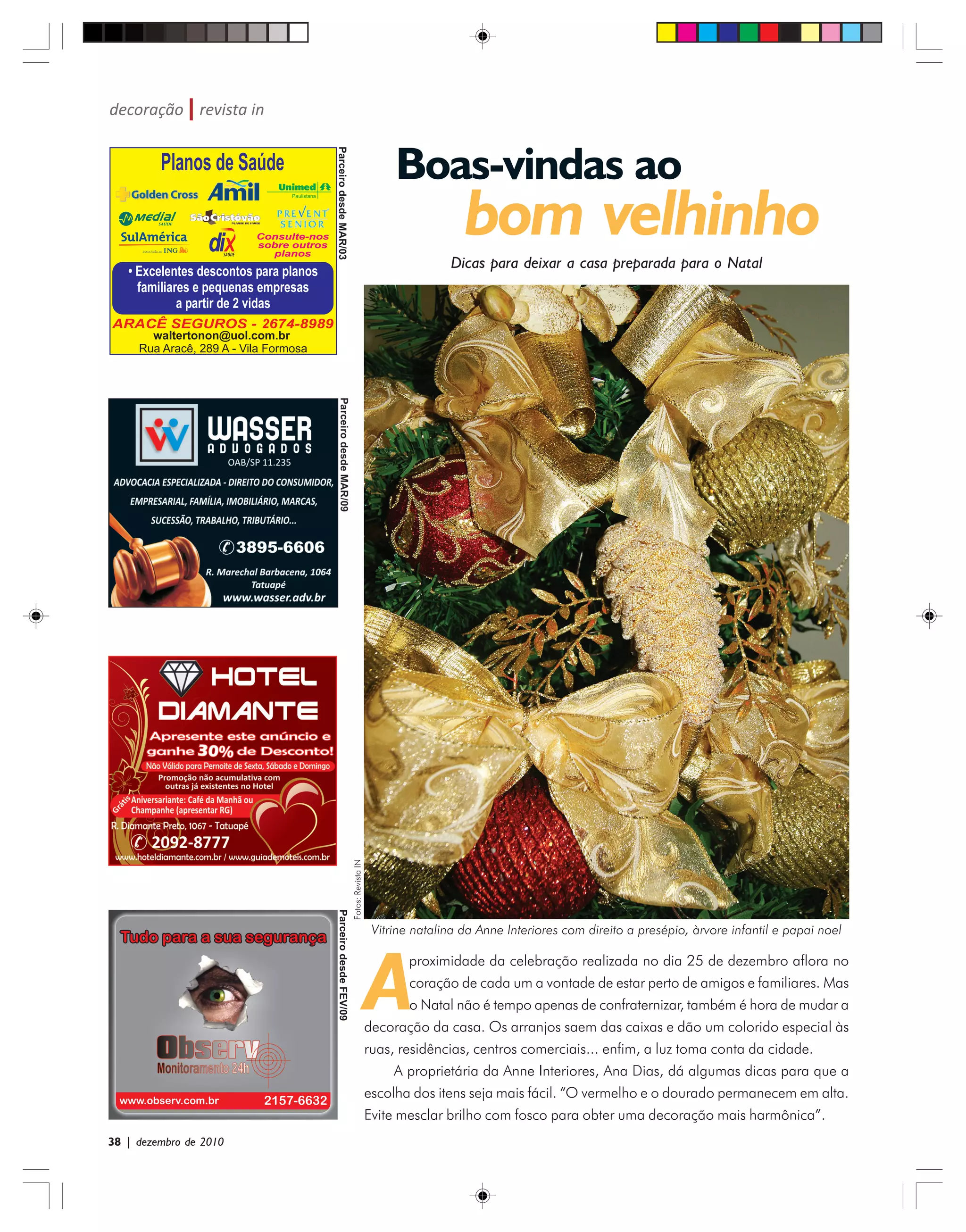 O documento fornece dicas para decorar a casa para o Natal, incluindo usar vermelho e dourado e evitar mesclar estilos brilhantes e foscos para uma decoração harmônica. A proprietária de uma loja de decoração também recomenda preparar a casa para receber amigos e familiares durante as festas de fim de ano.