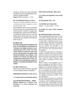 O documento resume uma homilia sobre o segundo domingo do Advento. Ele destaca a figura de João Batista como um exemplo de preparação para a chegada do Senhor através da conversão e do arrependimento. Além disso, convida os fiéis a também se prepararem para a vinda de Cristo através de obras de caridade e promoção da justiça.