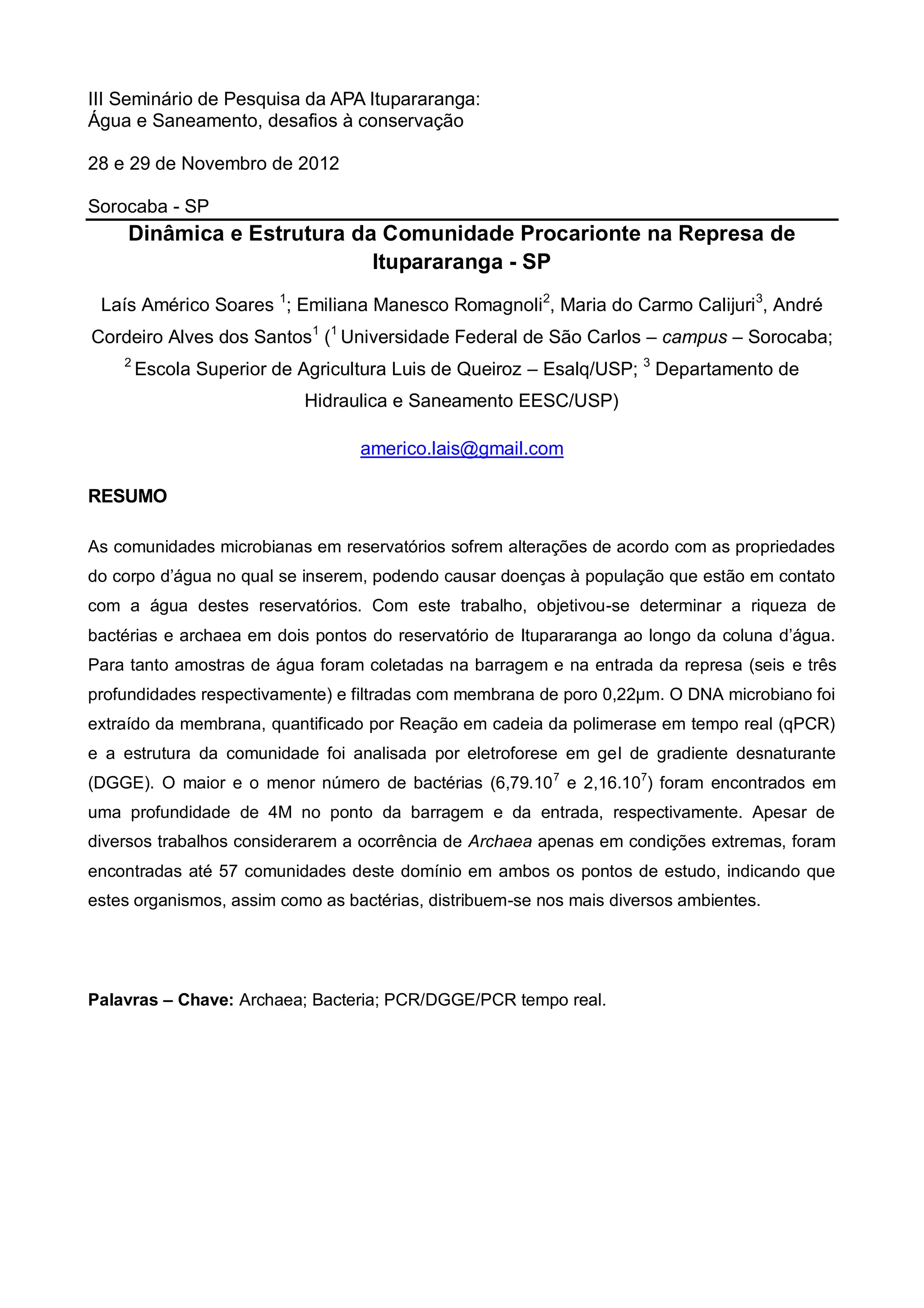 1. O documento descreve uma pesquisa sobre a dinâmica e estrutura das comunidades de bactérias e archaea na represa de Itupararanga, SP.