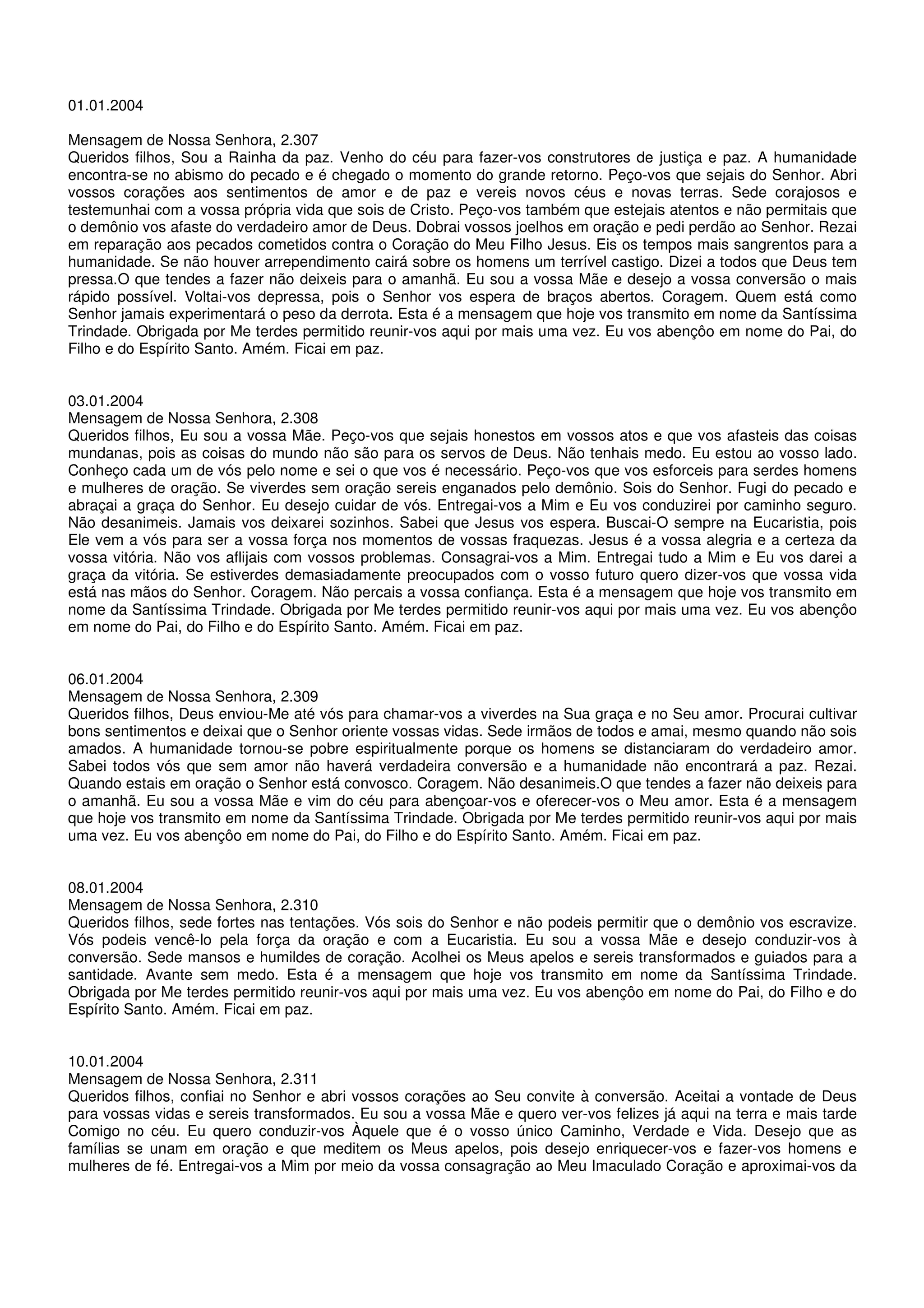 Nossa Senhora se apresenta como a Rainha da Paz e pede aos filhos que sejam construtores de justiça e paz, abrindo seus corações ao amor e à conversão, pois a humanidade encontra-se no abismo do pecado. Ela alerta para tempos difíceis e pede oração e arrependimento.