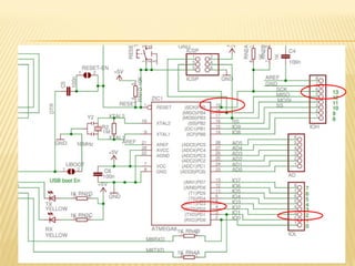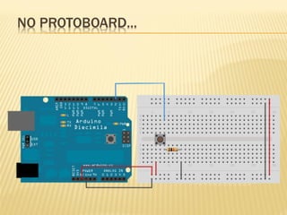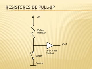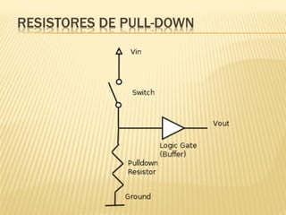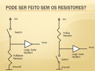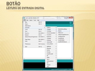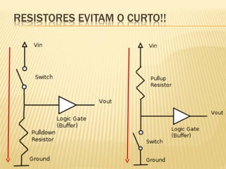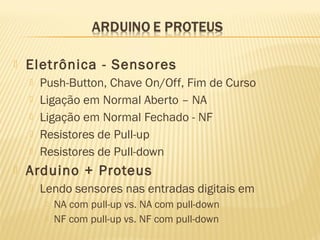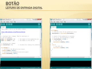 Este documento discute sensores digitais e como lê-los nas entradas digitais de um microcontrolador. Explica os tipos de sensores como botões, chaves e sensores de fim de curso, suas ligações em normal aberto e fechado, e o uso de resistores de pull-up e pull-down para evitar tensões flutuantes. Demonstra código Arduino para ler esses sensores.