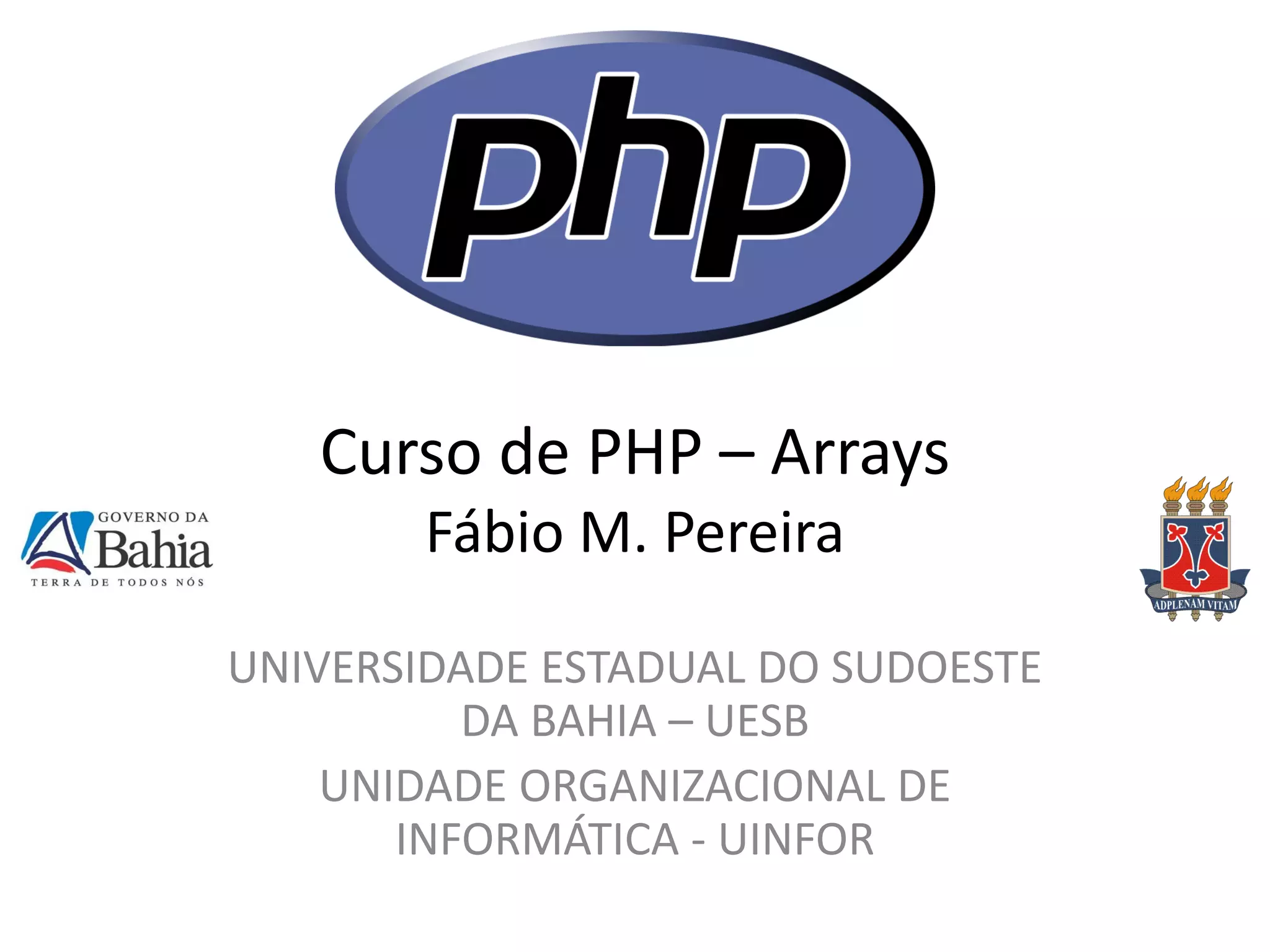 Este documento fornece um resumo sobre arrays no PHP. Ele discute arrays indexados versus associativos, como identificar e armazenar elementos em arrays, arrays multidimensionais, extrair múltiplos valores, percorrer e ordenar arrays.