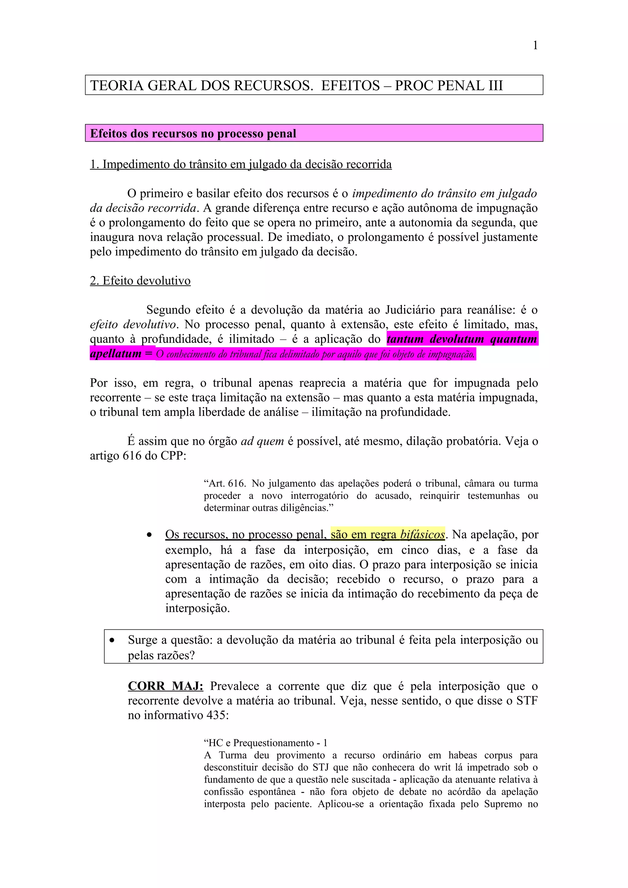 Os recursos no processo penal impedem o trânsito em julgado da decisão recorrida e devolvem a matéria ao Judiciário para reanálise, conhecido como efeito devolutivo. A devolução ocorre pela interposição do recurso, não pelas razões, sendo a extensão da reanálise delimitada pelo que foi objeto da impugnação. No júri, a devolução é limitada aos fundamentos da interposição do recurso.