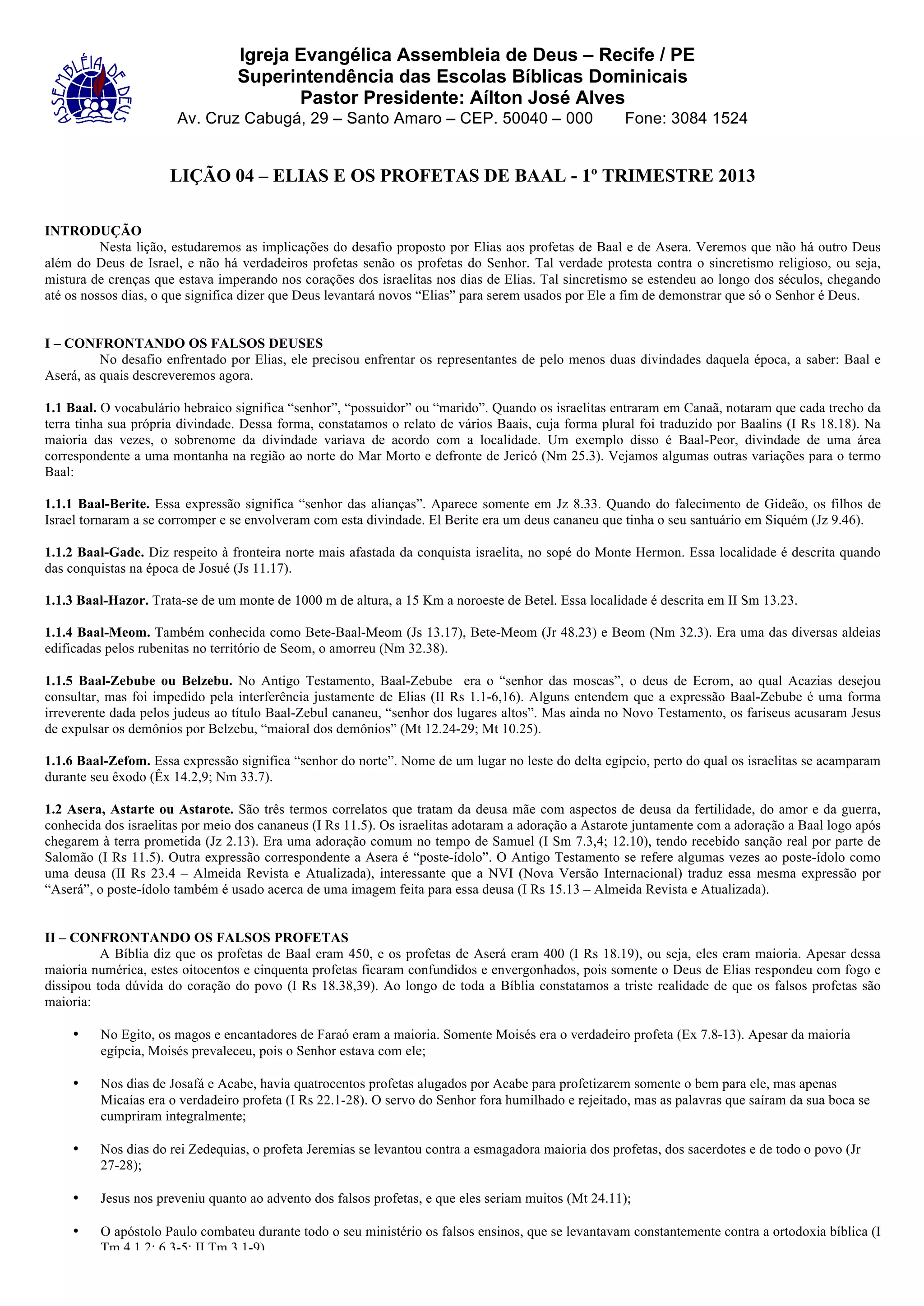 Este documento discute a lição bíblica sobre Elias e os profetas de Baal. Ele descreve como Elias desafiou os profetas pagãos a um confronto no Monte Carmelo para provar que apenas o Deus de Israel poderia responder com fogo do céu. Apesar de serem maioria, os profetas de Baal não puderam produzir fogo, enquanto que o Deus de Elias respondeu imediatamente, provando Sua divindade. O documento também discute a exigência de Deus de exclusividade na adoração e como Isso se