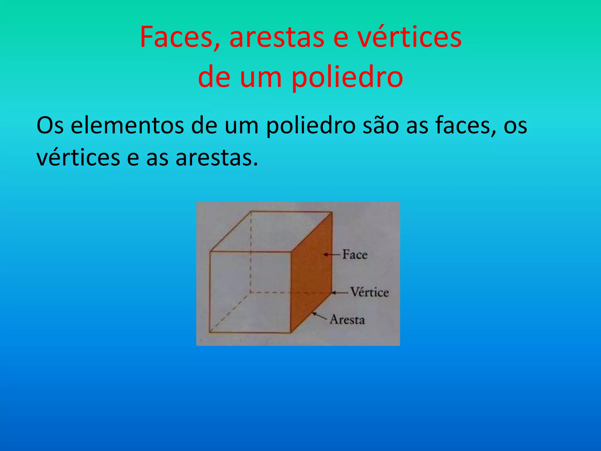 Os elementos básicos de um poliedro são as faces, arestas e vértices. Um cubo e um paralelepípedo têm 6 faces, 12 arestas e 8 vértices cada. O documento lista alguns exemplos de poliedros como pirâmide hexagonal, prisma hexagonal e pirâmide triangular.
