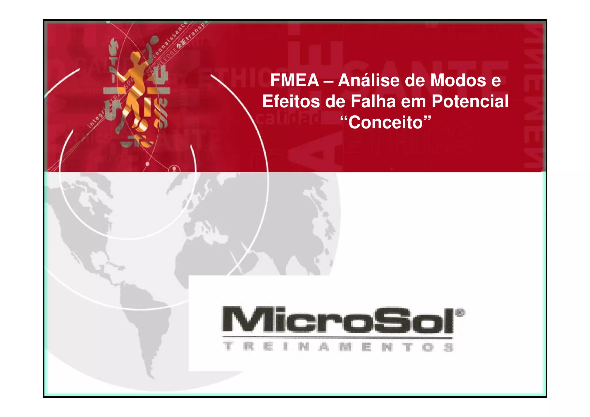 O documento fornece uma introdução sobre FMEA (Análise de Modos e Efeitos de Falha em Potencial) e MSA (Análise dos Sistemas de Medição). Apresenta conceitos iniciais sobre FMEA, sua relação com a norma TS-16949, definição de FMEA de projeto e processo, equipes de trabalho, implementação e desenvolvimento de FMEAs. Também introduz conceitos sobre análise de sistemas de medição, abordando variações como estabilidade, tendência e distribuição.