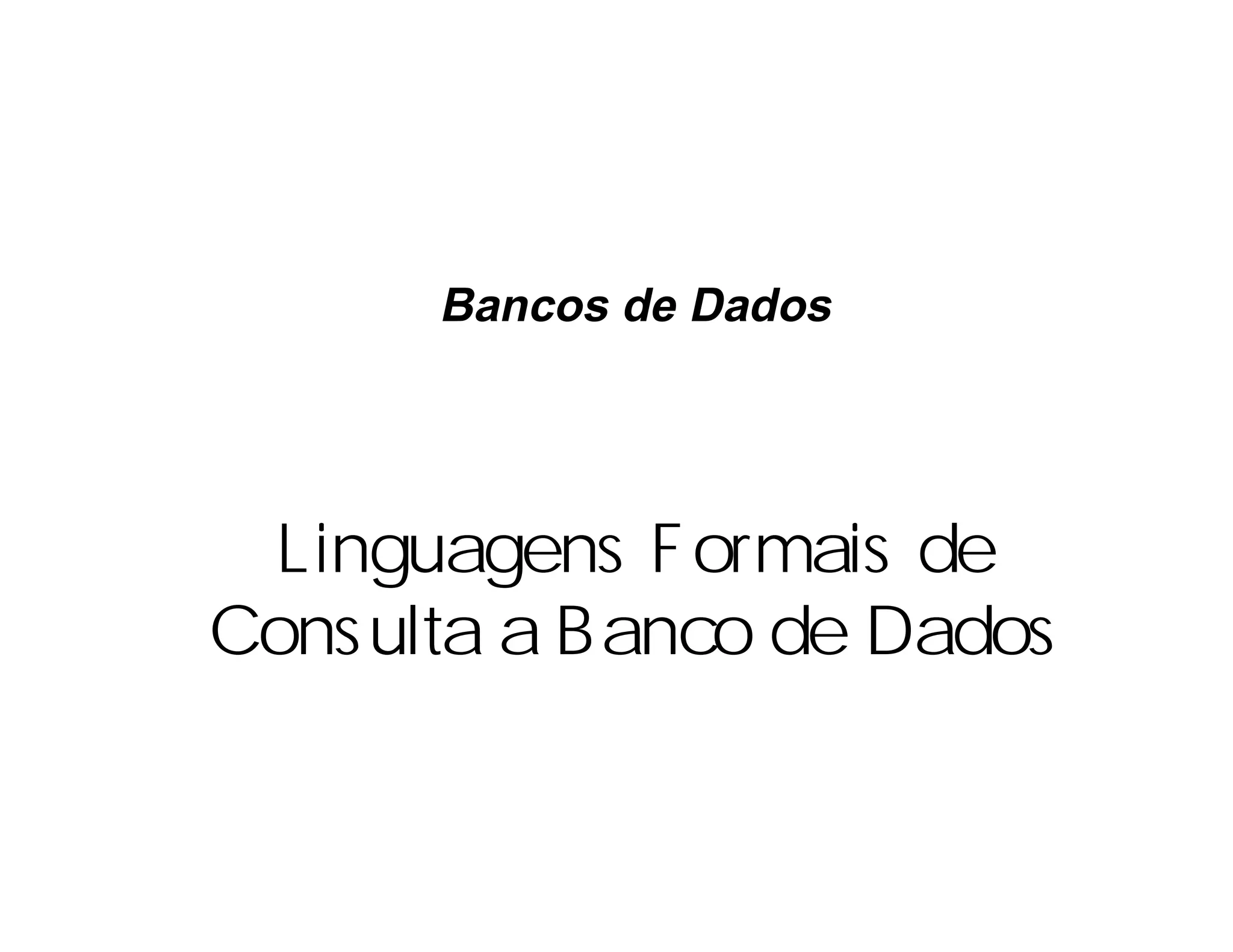 O documento discute linguagens formais de consulta a bancos de dados. Apresenta a álgebra relacional e o cálculo relacional como linguagens de consulta, demonstrando operações como seleção, projeção e junção. Inclui exemplos passo a passo de consultas a um banco de dados de controle de estoque usando essas linguagens.