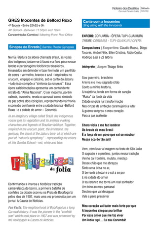 O documento resume o desfile da escola de samba GRES Inocentes de Belford Roxo. O tema do desfile é "Corumbá - Ópera Tupi-Guaiakuru" e conta a história da região de Corumbá através de 20 alas que representam aspectos da cultura, história e biodiversidade local.