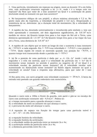 2) Os exercícios abordam conceitos como velocidade média, deslocamento, tempo para parar um carro freando com aceleração constante, lançamento de projéteis e movimento de elétrons em tubos de raios catódicos.