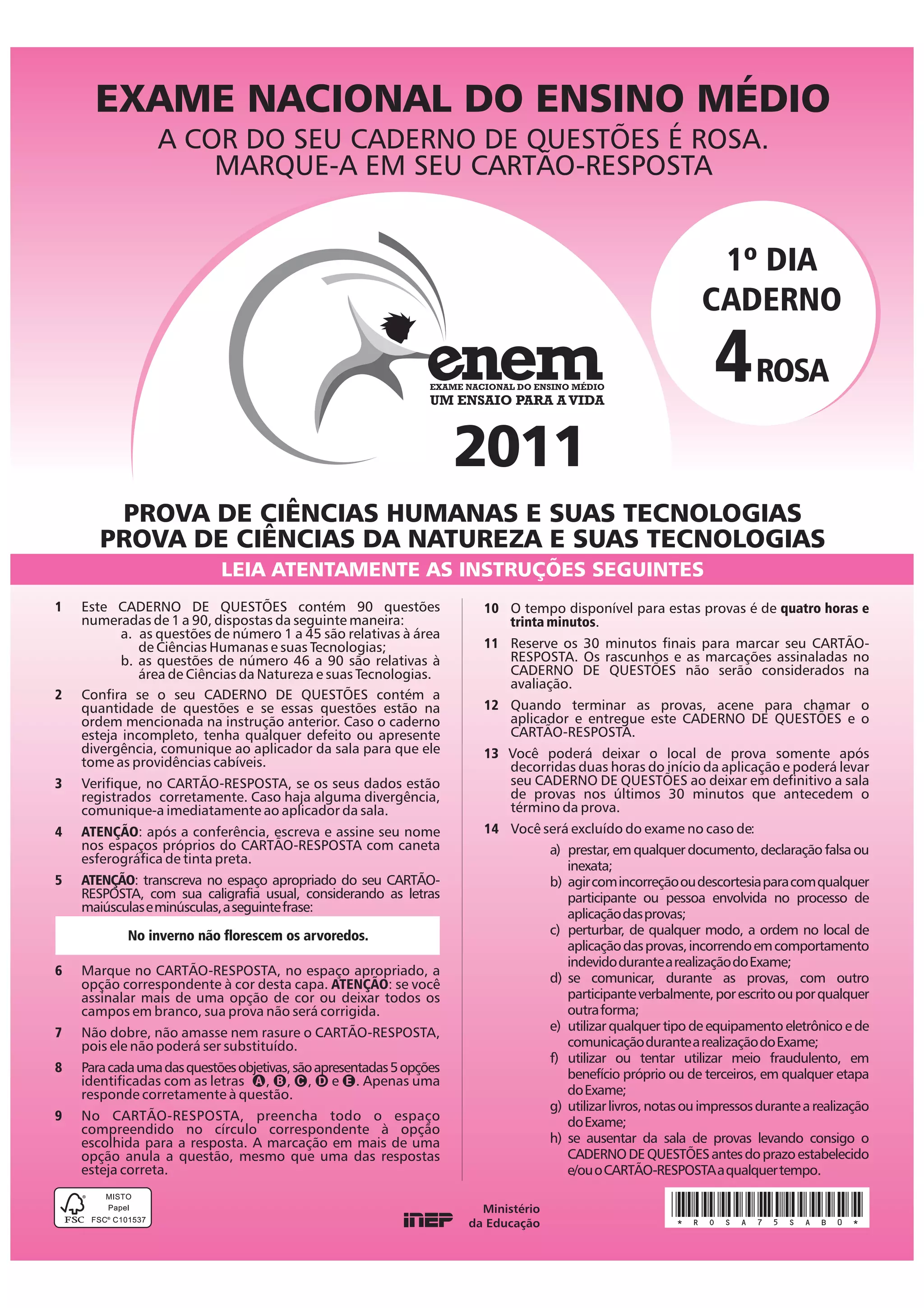 O documento trata de um exame nacional do ensino médio no Brasil. Ele fornece instruções sobre o caderno de questões, incluindo a cor rosa, e sobre o preenchimento do cartão-resposta. Também lista possíveis motivos para exclusão do exame e informa sobre o tempo disponível para realização da prova.